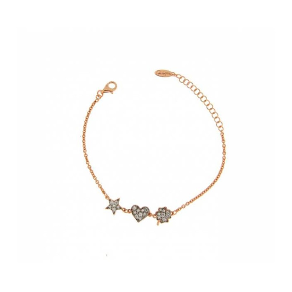 Braccialetto catenella con tre soggetti stella cuore e quadrifoglio con zirconi bianchi. Materiale: Argento 925°% galvanica oro rosa Lunghezza: 14 cm + estensione 5 cm Nichel free