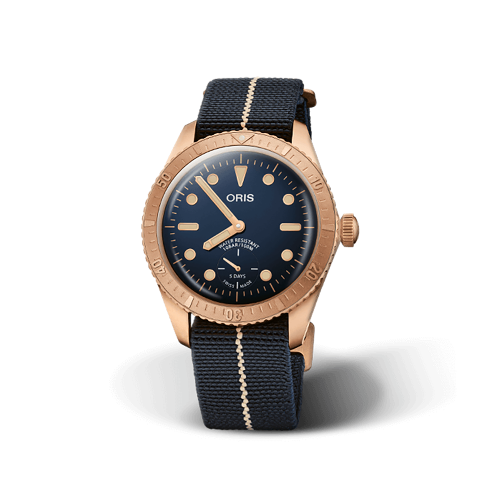 CASE Divers, 40.00 mm, 1.575 inches, Bronze MATERIAL Multi-piece bronze case, bronze minute scale top ring SIZE 40.00 mm, 1.575 inches TOP GLASS Sapphire, domed on both sides, anti-reflective coating inside CASE BACK Stainless steel, special engravings, screwed OPERATING DEVICES Bronze screw-in security crown WATER RESISTANCE 10 bar INTERHORN WIDTH 20 mm MOVEMENT Automatic winding small second developed by Oris NUMBER Oris 401 DIMENSIONS Ø 30.00 mm, 13 1/4’’’ FUNCTIONS Centre hands for hours and minutes, subsidiary second at 6 h WINDING Automatic winding, uni-directionally rotating rotor POWER-RESERVE 120 hrs VIBRATIONS 28’800 A/h, 4 Hz JEWELS 24 DIAL Blue MATERIAL Blue dial LUMINOUS MATERIAL Indices and hands Superluminova light old radium STRAP/BRACELET Textile MATERIAL Blue textile strap with Bronze buckle EXTRAS Special luxury wooden presentation box, certificate, limited to 2000 pieces