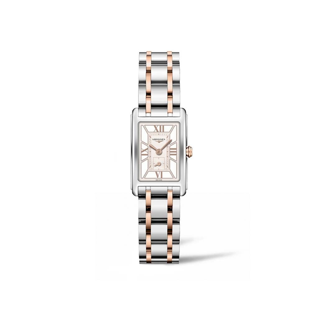 Fin dalla sua creazione, la collezione Longines DolceVita ha portato in tutto il mondo l'eleganza contemporanea della Maison orologiera Longines. Ispirata alla "Dolce Vita", è un inno alla dolcezza di vivere. Oggi, con un'interpretazione inedita dalle linee addolcite, si apre un nuovo capitolo della storia della collezione. Questi nuovi modelli sedurranno certamente le donne che hanno fatto del fascino uno stile di vita. CASSA Forma: rettangolare Materiale: acciaio inossidabile con corona in oro rosa 18 carati Vetro: vetro zaffiro antigraffio Dimensioni: 20,80 x 32,00 mm Distanza tra le anse: 15,00 mm Spessore: 6,90 mm Impermeabilità: impermeabile fino a 3 bar QUADRANTE E LANCETTE Colore quadrante: bianco Indici: numeri romani e indici dipinti Lancette: lancette rosa MOVIMENTO E FUNZIONI Tipo di movimento: al quarzo Calibro: L178 Funzione: ore, minuti e piccoli secondi a ore 6 Funzione speciale: E.O.L. CINTURINO Materiale: acciaio con maglia centrale rivestita in oro rosa 18 carati, 200 micron Fibbia: con chiusura déployante a tripla sicurezza e meccanismo di apertura a pressione
