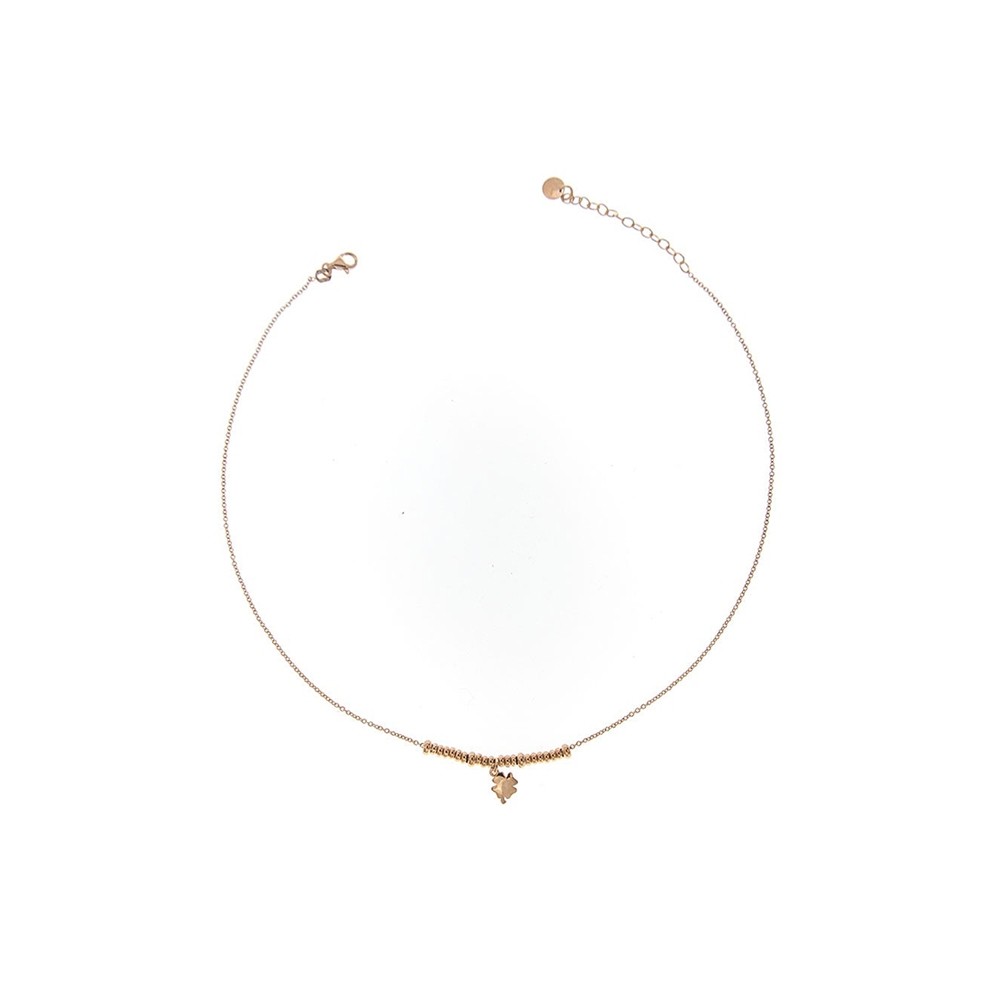 Girocollo con catenella, micro anelli e soggetto centrale quadrifoglio bombato. La lunghezza del Girocollo è 36 cm con 4 cm di estensione. Finitura: Placcatura oro rosa 18kt. Materiale: Argento 925.