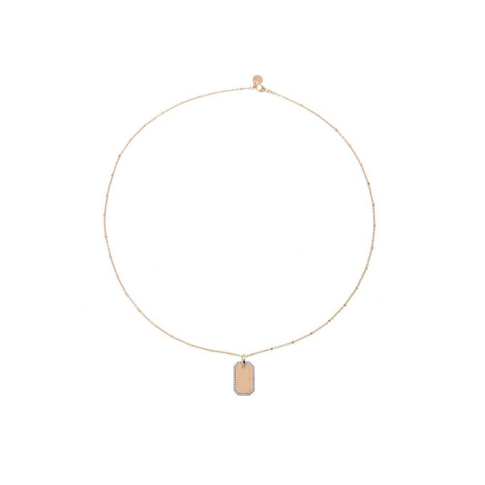 Girocollo con catena intervallata da pallino squadrato, il ciondolo è una medaglia rettangolare con texture liscia e contorno di zirconi bianchi. Perfetta per incisioni. La medaglia è lunga 1,8 cm e larga 0,6 cm. Il girocollo è lungo 42 cm con un attacco intermedio a 37 cm. Finitura: Placcatura oro rosa 18kt Materiale: Argento 925