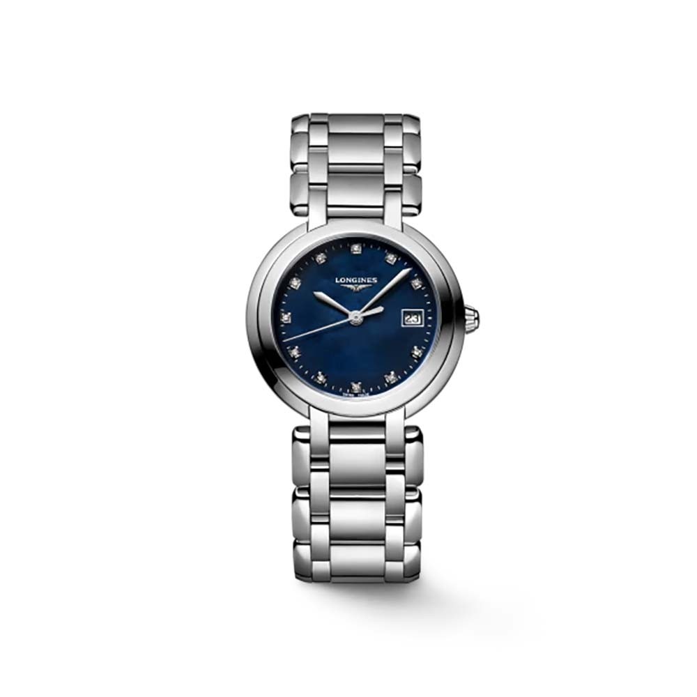 La Maison Longines è nota per i suoi modelli di orologi che propone sia alla clientela femminile sia a quella maschile, ma la collezione Longines PrimaLuna, presentata nel 2009, è destinata in esclusiva alle donne. La cassa caratteristica, come si evince dal nome, s’ispira alla luna e alla sua poesia. I quadranti argentati o madreperlati, impreziositi dai diamanti, evocano lo scintillio dell’astro notturno. I modelli sono dotati, a scelta, di movimenti al quarzo o di movimento automatico, in versione 3 sfere/data o con indicatore delle fasi lunari. CASSA Forma: rotonda Materiale: acciaio inossidabile Vetro: vetro zaffiro antigraffio bombato con trattamento antiriflesso multistrato sul lato interno Dimensioni: Ø 30,00mm Distanza tra le anse: 7,00 mm Spessore: 7,90 mm Impermeabilità: impermeabile fino a 3 bar Peso: 87,3 g QUADRANTE E LANCETTE Colore quadrante: madreperla blu Indici: indici di diamanti Lancette: lancette argentate lucide Diamanti: quadrante con 11 diamanti Top Wesselton VS-SI incastonati, per un totale di 0,044 carati MOVIMENTO E FUNZIONI Tipo di movimento: al quarzo Calibro: L129 Funzione: ore, minuti, secondi e data Funzione speciale: E.O.L. CINTURINO Materiale: acciaio inossidabile Fibbia: con chiusura deployante a tripla sicurezza e meccanismo di apertura a pressione