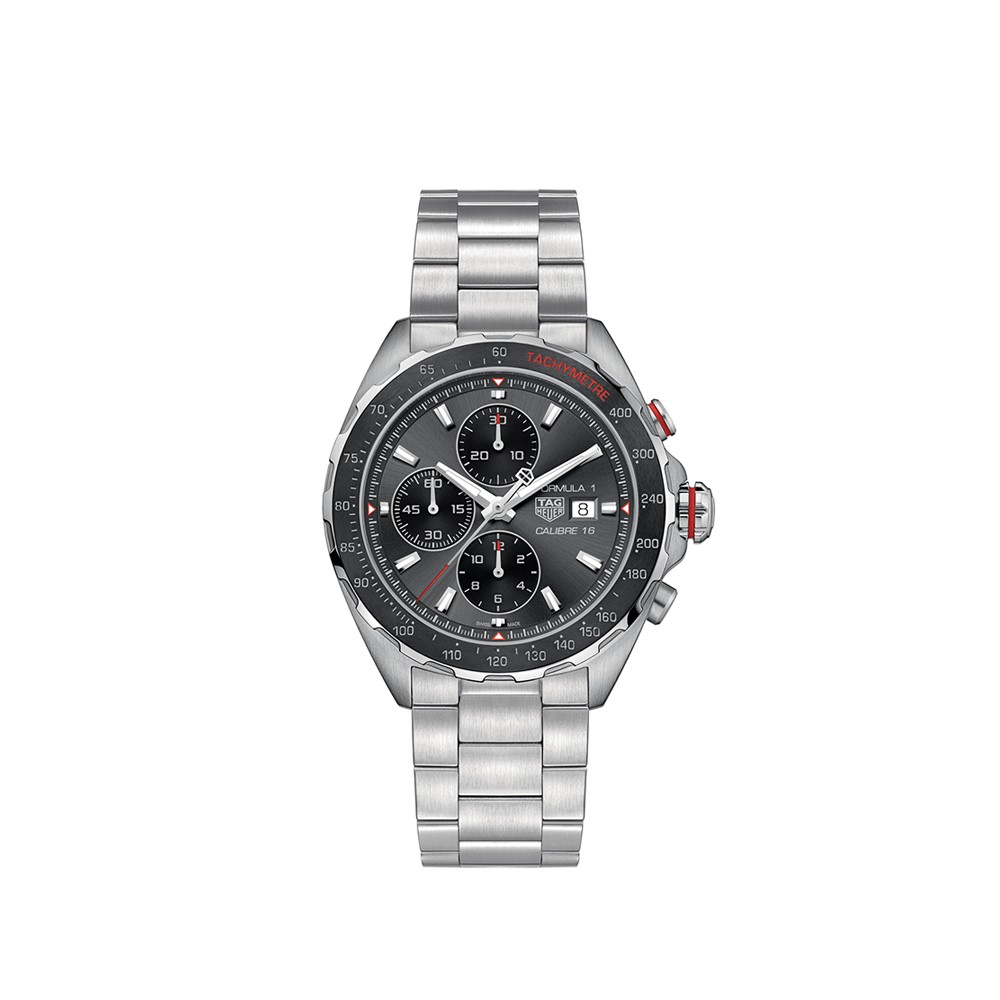 Misura 44 mm Impermeabilit? 200 m Corpo della cassa Acciaio Satinatura/lucidatura Lunetta Lunetta fissa Acciaio e ceramica Corona A vite Acciaio Fondello Liscio - Acciaio Cinturino: Materiale Acciaio Finiture Satinatura/lucidatura Fibbia Fibbia pieghevole con pulsanti - Satinata Acciaio Quadrante: Finiture Spazzolato con effetto soleil Colore Grigio Indice Applicati Movimento: Calibre Calibre 16 Automatico Movimento Cronografo automatico Riserva di carica 42 H Frequenza del bilanciere 28'800 (4 Hz) Funzioni Ore, Minuti, Chronograph : 1/4 secondo, contatore 30 minuti, contatore 12 ore, Data